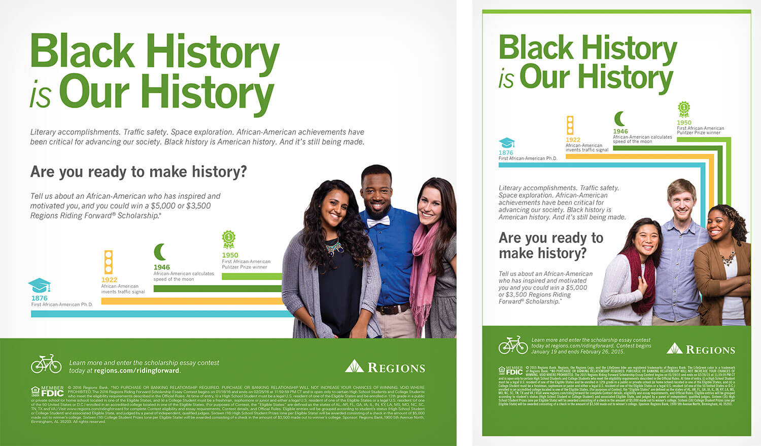 To help Regions Bank honor Black History Month in a significant and tangible way, o2 created the Regions Riding Forward Scholarship. This initiative not only helped students earn $5,000 scholarships for college, it also educated today’s youth on the importance of black history as a part of American history.